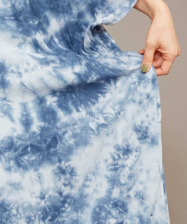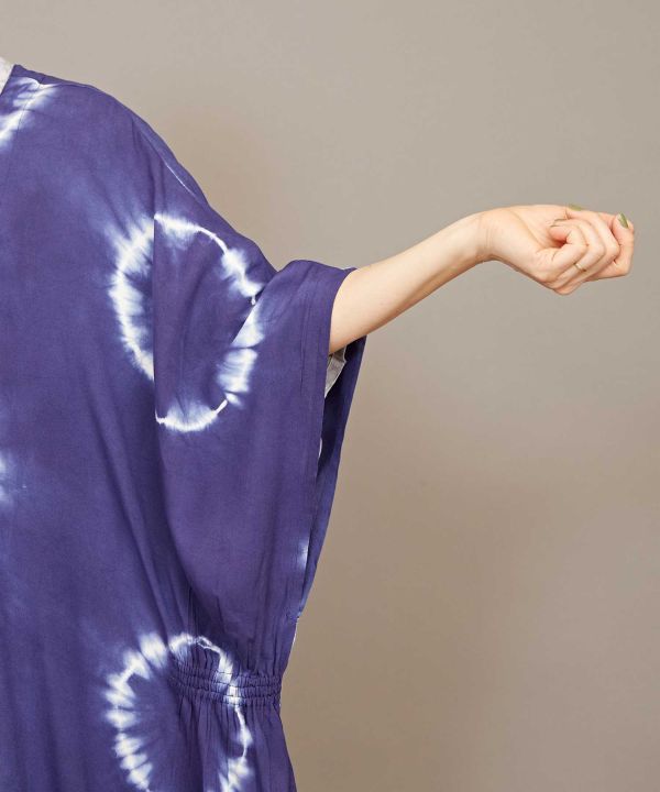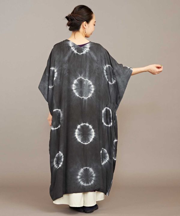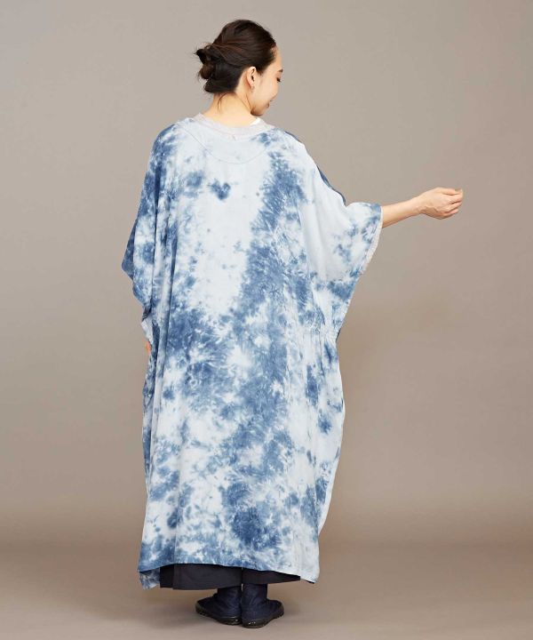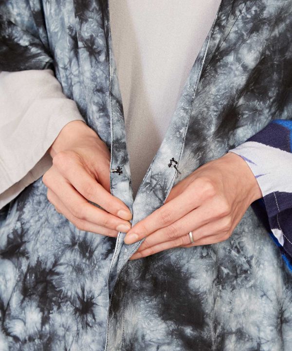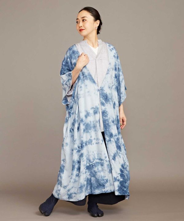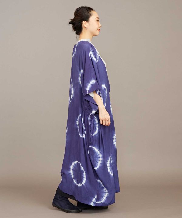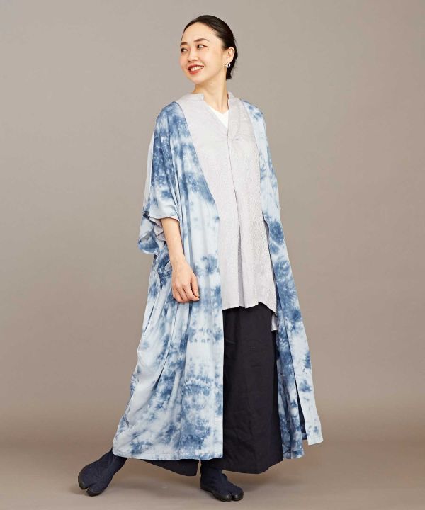 和を感じる深みのある色を、手染め(タイダイ)で独創的に表現した羽織。ポンチョのような形で、脇にはゴムが入っていてシルエットが綺麗に見えます。UVカット加工がほどこされていますので、陽射しの強い季節のお出かけにもぴったり。大人っぽく凛とした和モダンスタイルに。