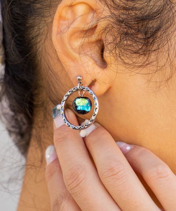 大地の輝きを閉じ込めたような、神秘的なホタル玉のピアス。虹彩の輝きを放つホタル玉とリングの組み合わせでシンプルながらも存在感のあるデザインに。きらりと光るホタル玉が風に揺れて、耳元を彩ります。