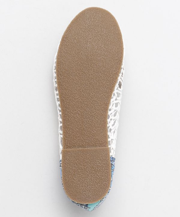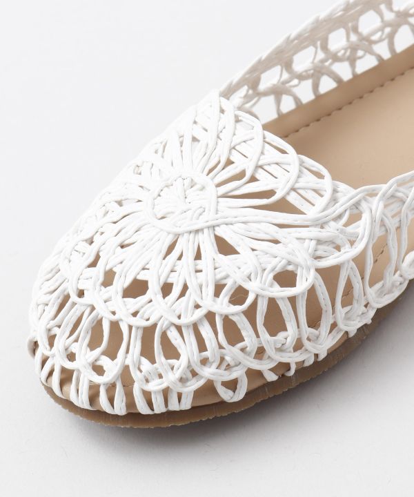 足元から春夏の気分を盛り上げてくれるパンプス。フラワーを表現したクロッシュ風の編み方で、軽い履き心地と上品さをプラス。かかと部分には、アクセントに鮮やかな柄生地を組み合わせました。リゾート感あふれる着こなしにおすすめです。