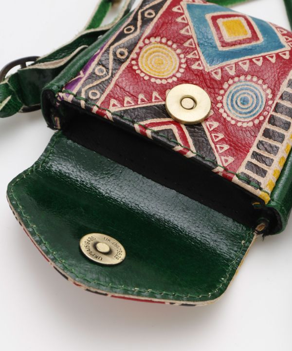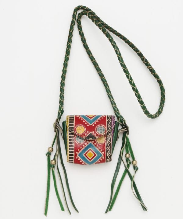 ネイティブ柄を色鮮やかにデザインしたポーチネックレス。ポーチはマチ付きで、マグネットのボタンで開け閉めができるので、ちょっとしたアクセサリーやワイヤレスイヤホンなどを入れるのにも便利です。フリンジにはメタルビーズのワンポイント。山羊革の独特の味わいを楽しみつつ、コーディネートのワンポイントに。
