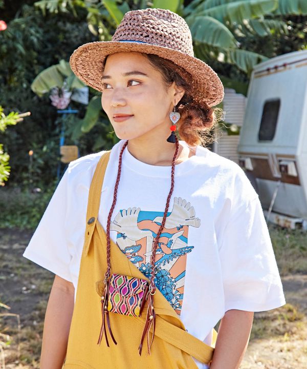 ネイティブ柄を色鮮やかにデザインしたポーチネックレス。ポーチはマチ付きで、マグネットのボタンで開け閉めができるので、ちょっとしたアクセサリーやワイヤレスイヤホンなどを入れるのにも便利です。フリンジにはメタルビーズのワンポイント。山羊革の独特の味わいを楽しみつつ、コーディネートのワンポイントに。