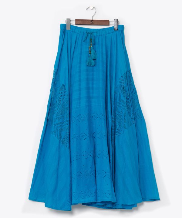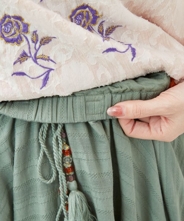 ふんわり揺れるフレアスカート。複数のレース生地を組み合わせた表情豊かなデザイン。大きなタッセル付きで華やかさもUP。