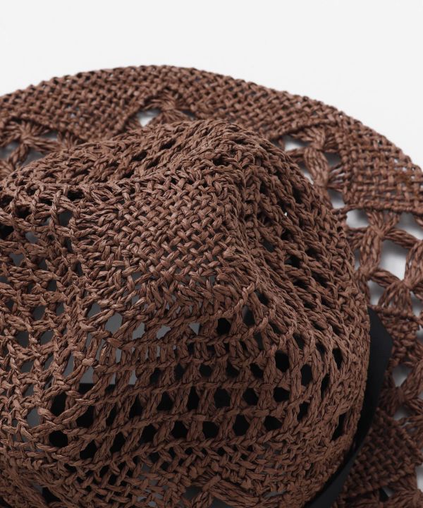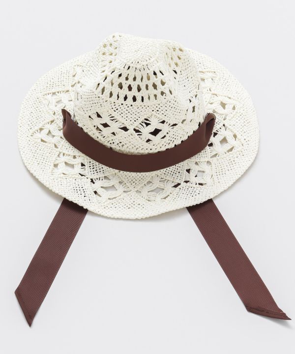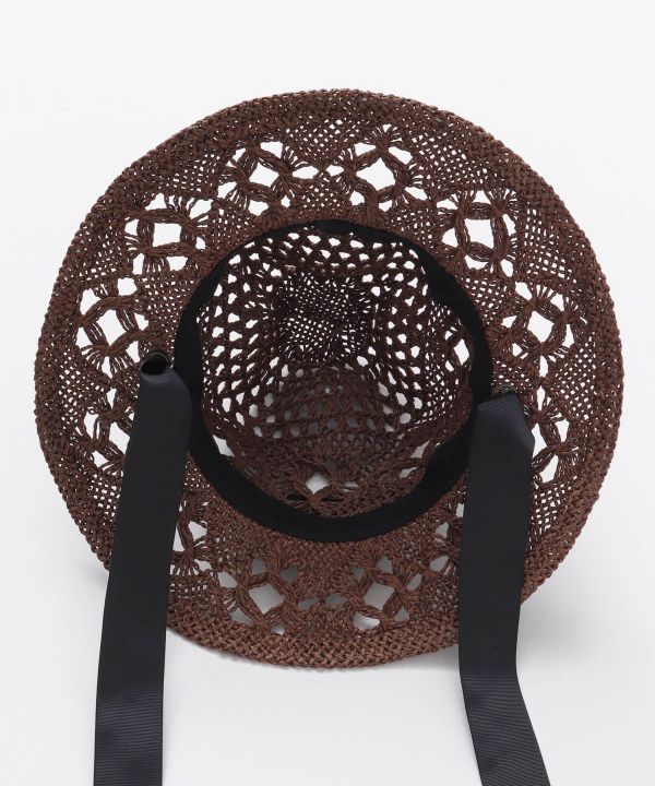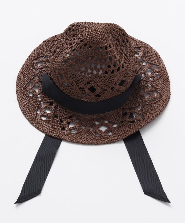 幾何学模様の編地が個性的な、変形マウンテンハット。歩くたび風にゆれるリボンがモードなスタイルにアクセントを。内側にはサイズ調節付き。