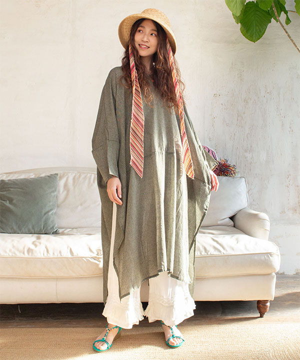 ネパールコットンを使用したスリット入りワンピース。風通しが良く、リラックス感のあるシルエット。落ち着いたストライプ柄がモード感を演出する一枚。カジュアルシーンにも大活躍。
