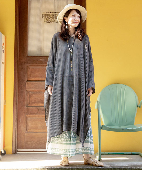 ネパールコットンを使用したスリット入りワンピース。風通しが良く、リラックス感のあるシルエット。落ち着いたストライプ柄がモード感を演出する一枚。カジュアルシーンにも大活躍。