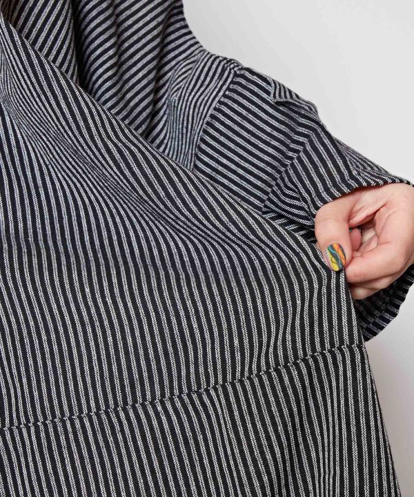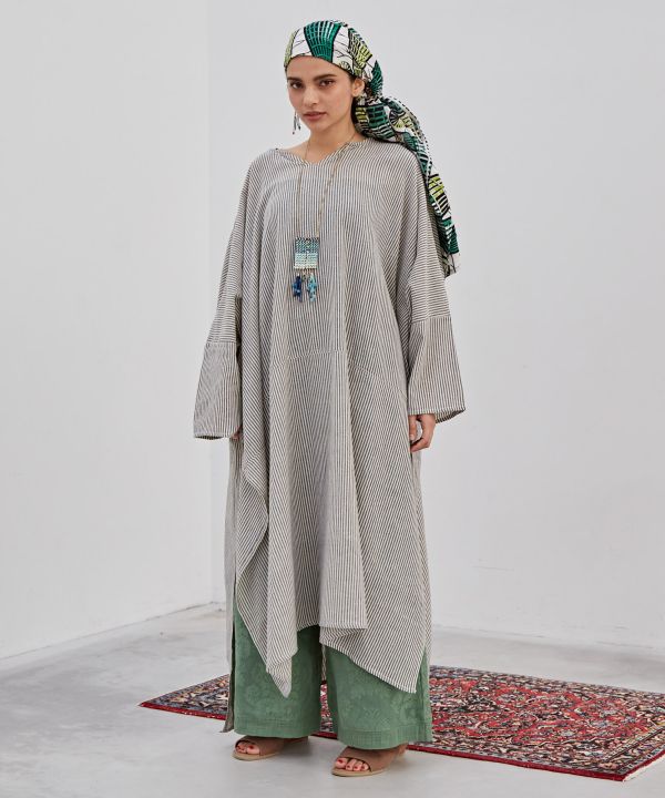 大胆なスリット使いが印象的なワンピース。ゆったりとしたサイズ感でサイズレスで着られる。柔らかいネパール生地が風を通して心地よい。落ち着いた色合いのストライプ柄がシックなモードを引き立たせてくれる。カジュアルシーンにも大活躍。