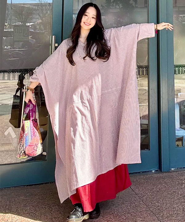 ネパールコットンを使用したスリット入りワンピース。風通しが良く、リラックス感のあるシルエット。落ち着いたストライプ柄がモード感を演出する一枚。カジュアルシーンにも大活躍。
