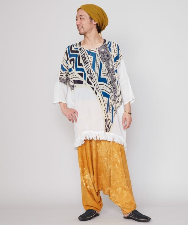 柔らかなカットソー素材を使用したメンズサルエルパンツ。アシッドウォッシュ加工が施されており、一枚一枚色の抜け方が異なる唯一無二の風合い。両サイドにはポケットが付き、ウエスト部分はゴムと紐でサイズ調整が可能。ユニセックスで着用可能。あなただけの世界に一枚を選んで。