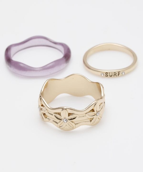 プルメリアモチーフやSURFの刻印が施されたデザインの、3個セットリング。プルメリアモチーフのリングはサムリングとしてもお使いいただけます。セット使いでこなれ感も。