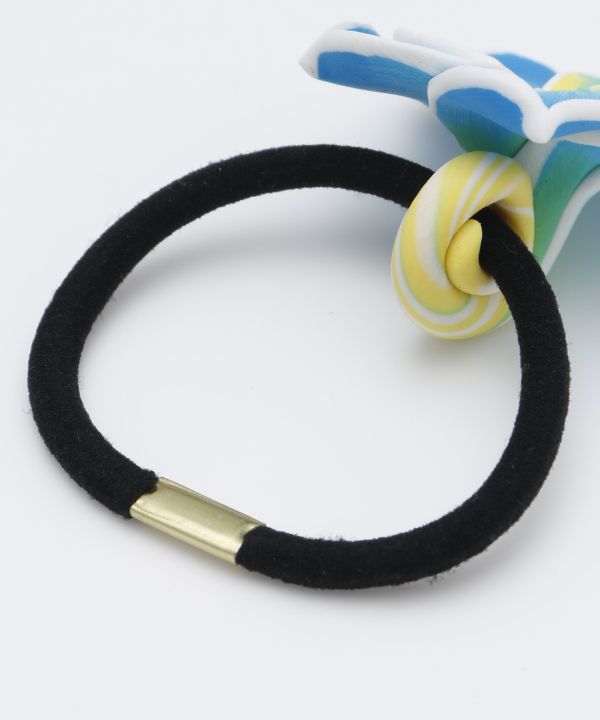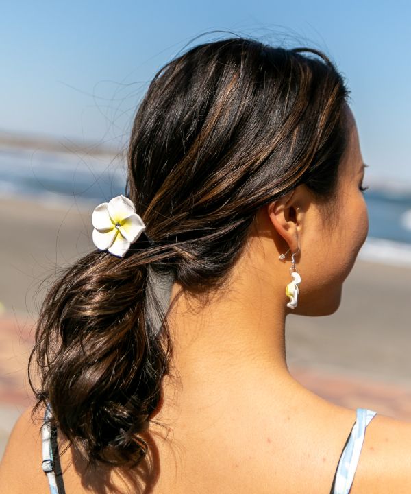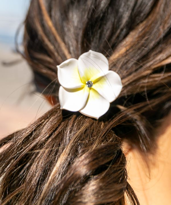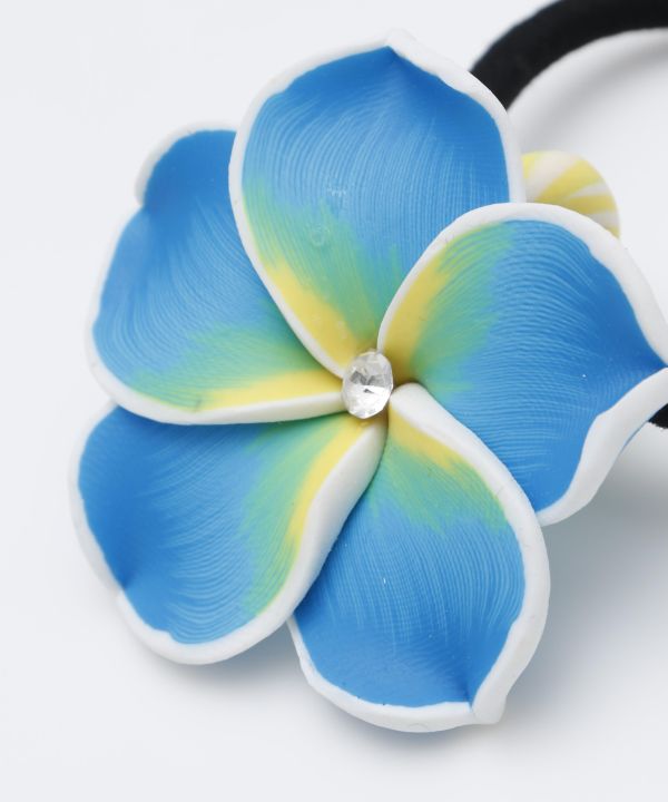 色鮮やかな大きなプルメリアが目を惹くヘアゴム。キラッと光るストーンがポイントに。