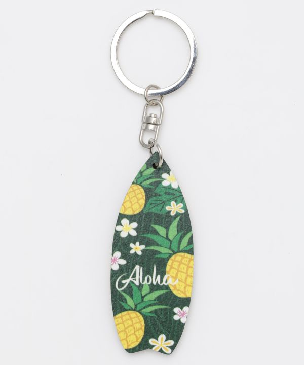 サーフボードにカラフルなHAWAII柄がデザインされた、ウッドのキーホルダーです。鍵に付けたりバッグのチャームなどにおすすめです。HAWAII直輸入。