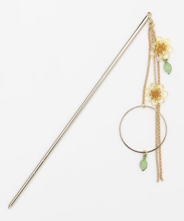 日本の夏の花々を、ガラスビーズで表現したかんざし。ゴールドの長めのチェーンは、上品な存在感があります。
