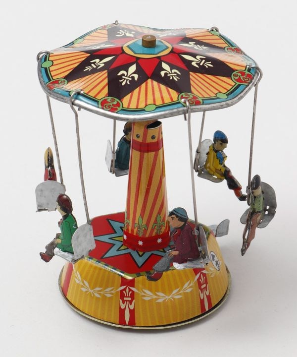 ノスタルジックなブリキのおもちゃ。土台のレバーを引くと、カルーセルにのった人たちがくるくると勢いよく回りだします。昔の遊園地にありそうなレトロなデザインのカルーセルが懐かしさを感じさせます。※安全上の理由から、子供のおもちゃとしては適していません。