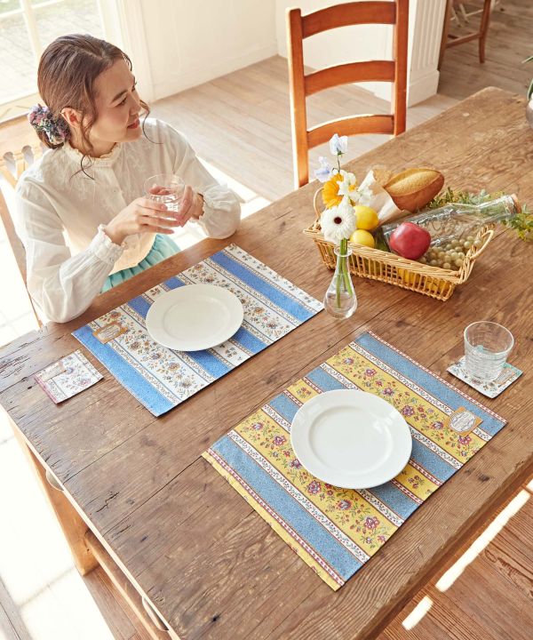 南フランスから輸入した生地を使用したプレイスマット。プロヴァンスならではの自然をモチーフにしたテキスタイルが魅力的。ヴィンテージ感のあるラベル付きで高級感が漂います。南仏の風に包まれて、ちょっと豊かに過ごす毎日を。