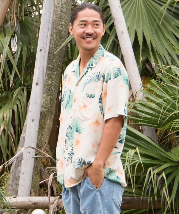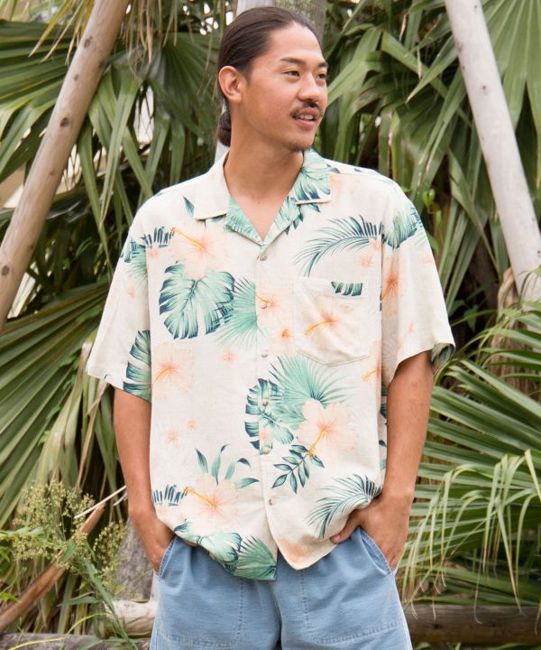 汗ばむ季節にもサラリと心地よいレーヨン麻素材を使用したメンズアロハシャツ。通気性が良く、軽やかな着心地です。ヴィンテージ風のボタニカル柄プリントがリゾート感を演出し、羽織るだけでロコ気分を楽しめます。