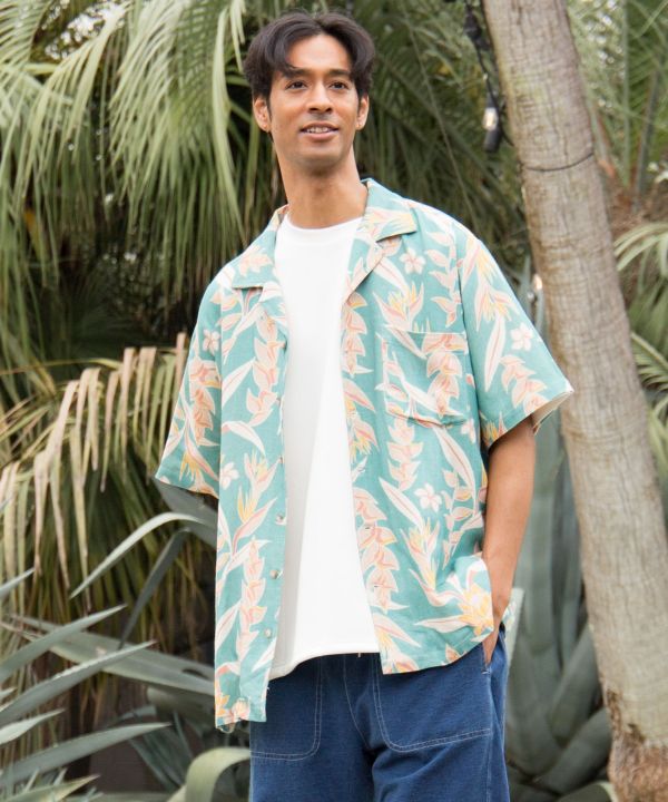 汗ばむ季節にもサラリと心地よいレーヨン麻素材を使用したメンズアロハシャツ。通気性が良く、軽やかな着心地です。ヴィンテージ風のボタニカル柄プリントがリゾート感を演出し、羽織るだけでロコ気分を楽しめます。
