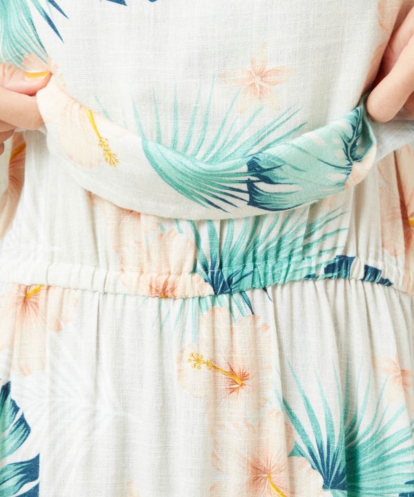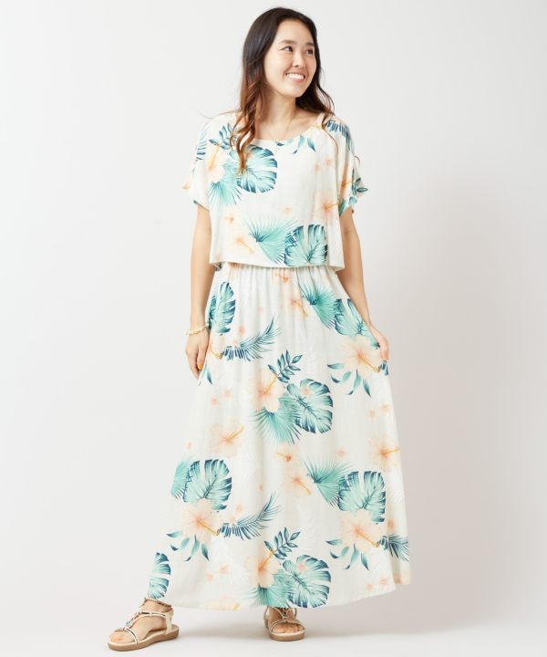 レーヨン麻素材を使用したワンピース。さらりとした肌触りで快適な着心地です。ハワイを代表するボタニカル柄をヴィンテージ調にプリントし、ウエストゴム仕様で自然なメリハリを演出。セットアップ風のデザインが魅力です。