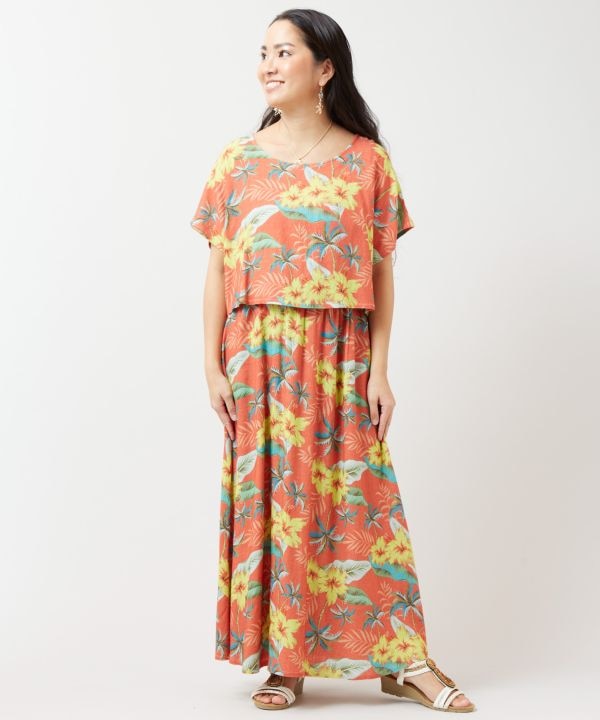 レーヨン麻素材を使用したワンピース。さらりとした肌触りで快適な着心地です。ハワイを代表するボタニカル柄をヴィンテージ調にプリントし、ウエストゴム仕様で自然なメリハリを演出。セットアップ風のデザインが魅力です。