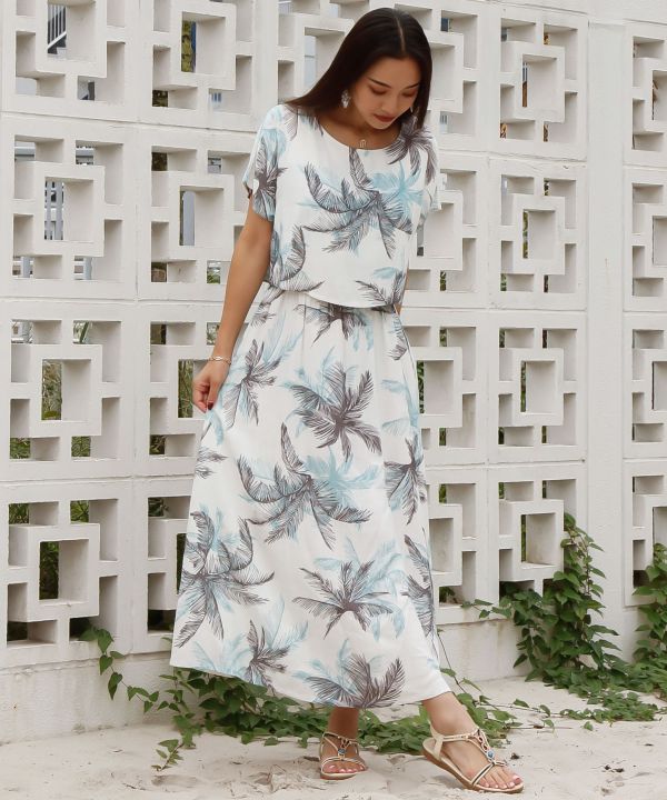 レーヨン麻素材を使用したワンピース。さらりとした肌触りで快適な着心地です。ハワイを代表するボタニカル柄をヴィンテージ調にプリントし、ウエストゴム仕様で自然なメリハリを演出。セットアップ風のデザインが魅力です。