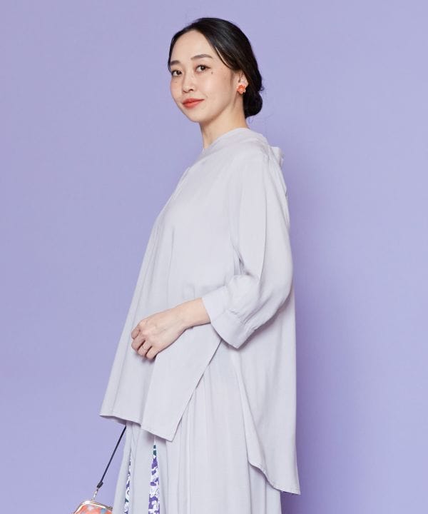 さらりとした落ち感のあるレーヨン素材で夏でも涼やかなトップス。サイドに入ったスリットで前身ごろをパンツインでき、お洒落に着こなせます。着物の隠れたお洒落「八掛(はっかけ)」をイメージ。歩いたときにちらりと覗くのは華やかな牡丹、涼しげな波、新緑の朝顔、爽やかな紫陽花。着物のような襟あわせで、正面は無地なので普段使いにもおすすめです。