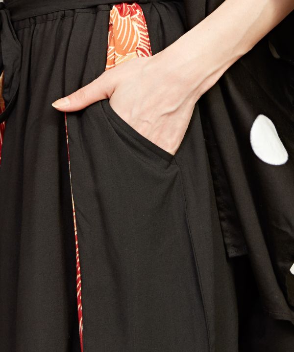 夏らしい4つの色味で四季を感じる、着物の隠れたお洒落「八掛(はっかけ)」をイメージしたスカート。歩いたときにちらりと覗くのは華やかな牡丹、涼しげな波、新緑の朝顔、爽やかな紫陽花。行灯袴(あんどんばかま)という、スカートのような袴をリデザイン。レーヨン素材で柔らかな穿き心地。表面は無地で着易く、歩いたときに現れる柄がさりげない和を演出してくれます。ウエストはゴム仕様でリボン付き。さりげなく柄が見えるポケットもお洒落です。