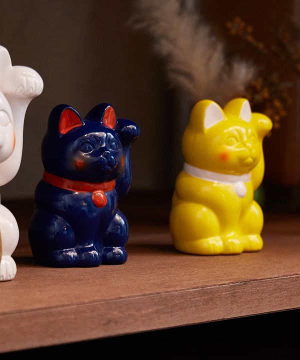 ほっぺを赤くした姿がなんとも愛らしい常滑焼の招き猫。カラフルでポップな彩りでお部屋のインテリアに。左手を上げている招き猫は「人を招く」と云われています。貯金箱になっているのでお金を貯められます。贈り物にもおすすめ。
