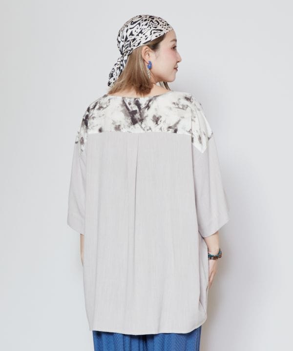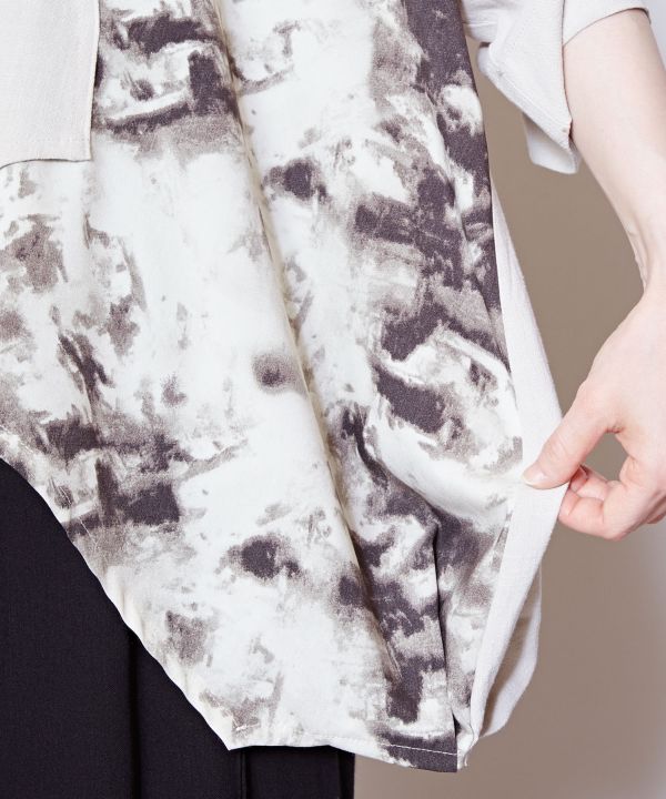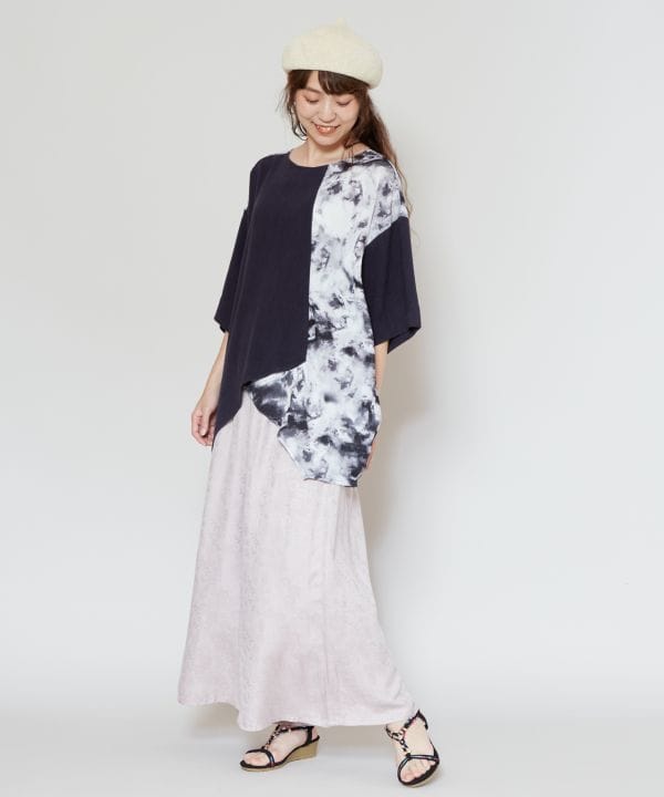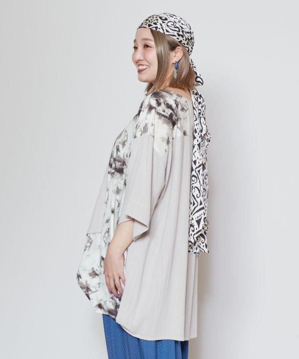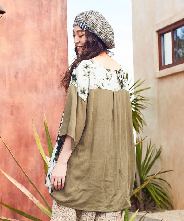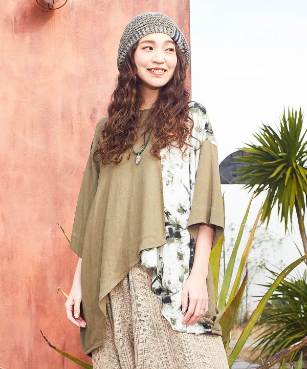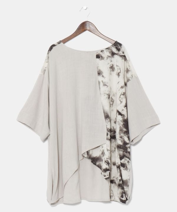 落ち感のある素材と、タイダイ柄の合わせがシックに決まる大人コーデにぴったりの一枚。綿麻素材でサラリと着れる。ゆったりとしたシルエットと、後ろ下がりのデザインでコーデを美しく引き立ててくれること間違いなし。