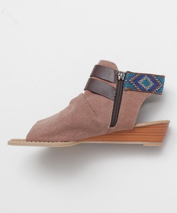 程よい高さのウェッジソールとしっかりしたホールドで安定した履き心地。フェイクレザーのベルトがアクセント。