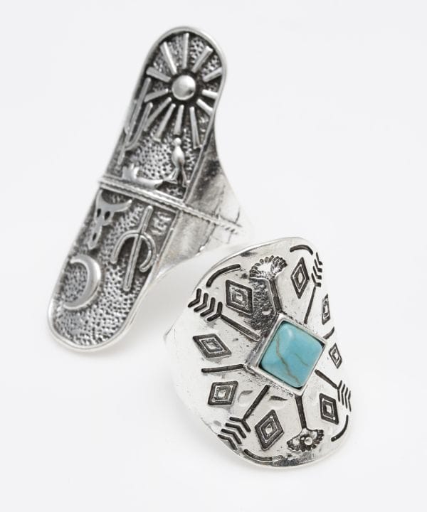 メキシコのモチーフを描いた色んなサイズのセットリング(9個)。シルバー×ターコイズのシンプルなデザインで重宝する事間違いなし。つけるだけで雰囲気も気分も上がるアイテムです。