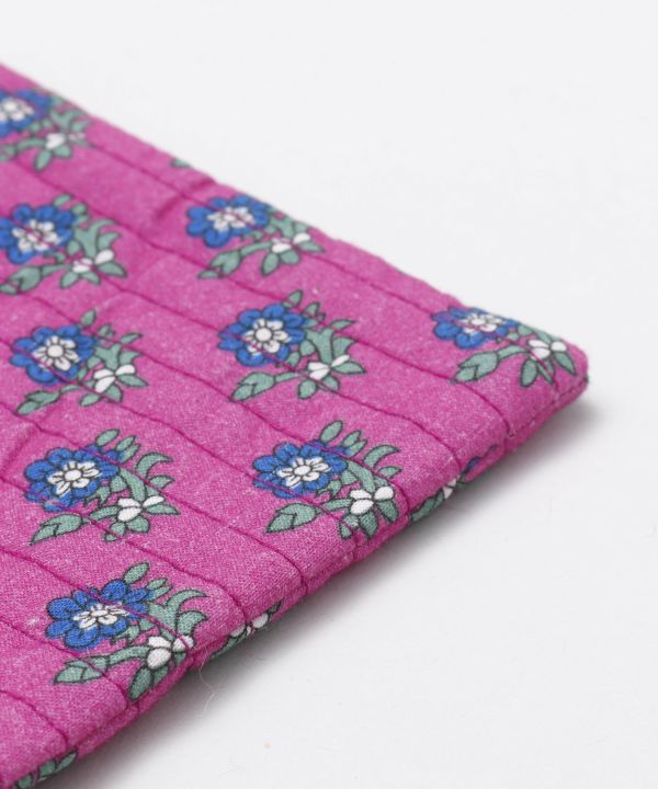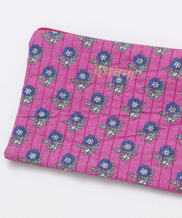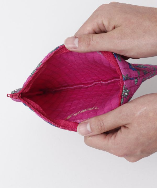 小物の収納に便利な綿素材ポーチ。ヒンディ語で「ハンドメイド」という意味の刺繍があしらってあります。