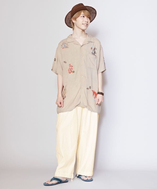 ゆったりとしたラフなシルエットのメンズパンツ。ウエストの織りテープがコーディネートのアクセントに。裾の紐を絞ることでシルエットの変化を楽しめます。両サイドと後ろに計3つポケット付き。