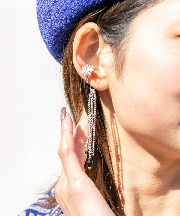 サンモチーフのイヤーカフ。ピアスの穴がなくても耳に挟むだけで簡単装着。動くたびに揺れるビーズと太陽のモチーフが、耳元を煌びやかに演出してくれるアイテムです。