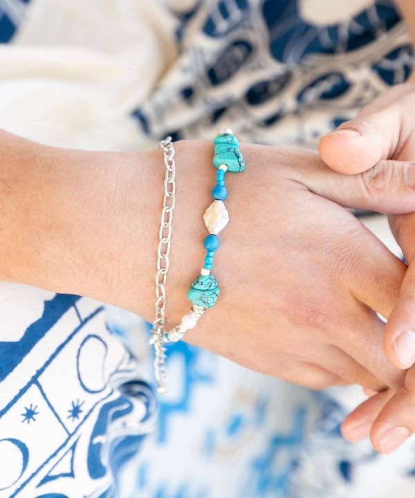 ターコイズとメタルの組み合わせが手元をかっこよくしてくれる2連ブレスレット。ユニセックスアイテム。