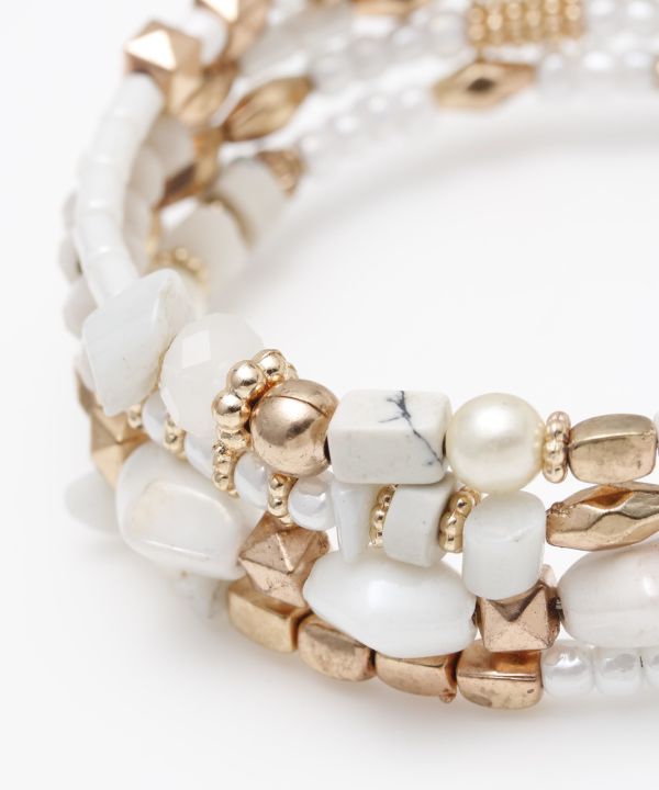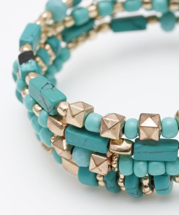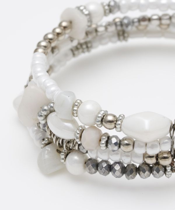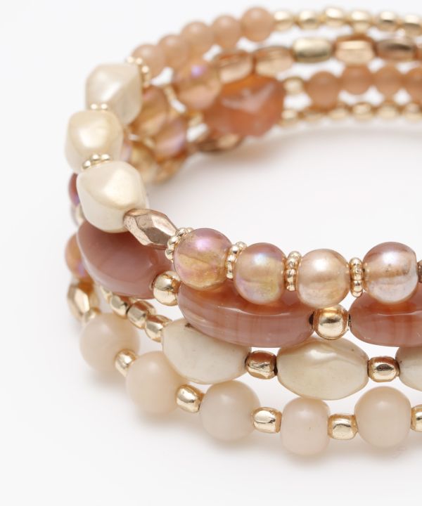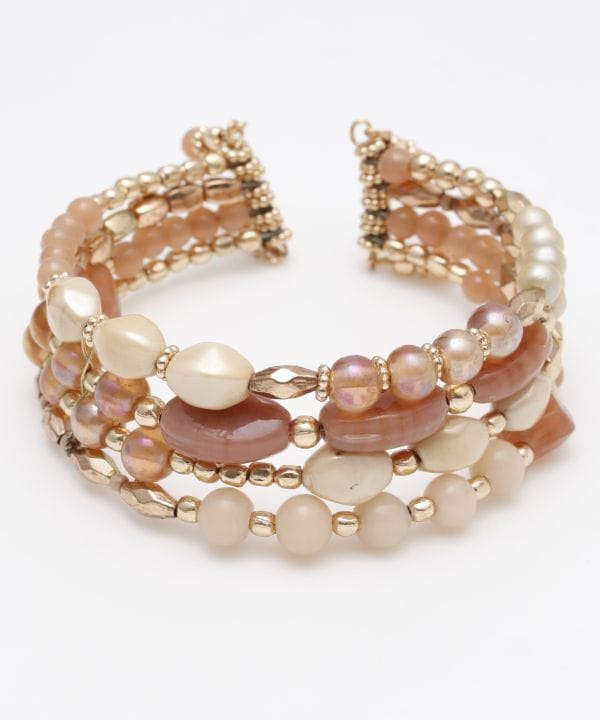 キラキラとした大小様々なビーズの太バングル。手元を明るくしてくれ、コーデのアクセントにもなるデザインです。