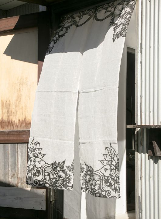 【Amina×VORRUK】縦150p×横86pの金糸入りの発色のいい色合いが特徴的なノレン。透け感があるので光を感じられる。神聖な植物をペイティングで表現する、タイのアーティスト「VORRUK」とのコラボ商品。