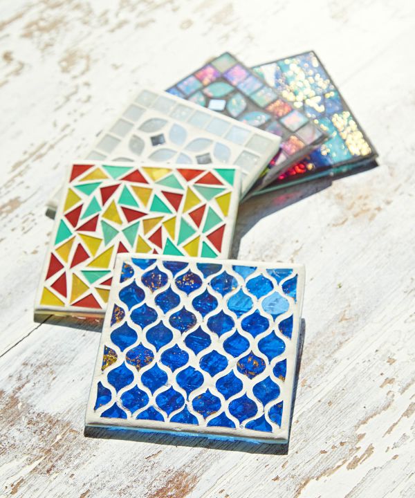 スペインのモザイクやタイル柄をイメージした、ガラス製コースター。滑り止め付き。