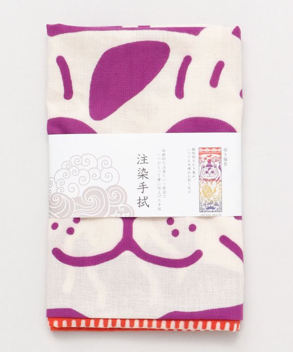 おめでたい縁起柄が散りばめられた何か良いことがありそうなデザインの手拭い。鶴に富士山に鯛に小判、天晴れ!縁起の招き猫