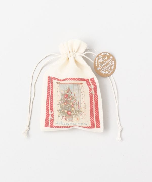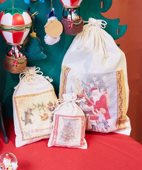 ホリデーカードなどのヴィンテージイラストを使用した巾着袋。コットンの素朴な風合い。アクセサリー類や、ちょっとしたお菓子、ステッカーなどプチギフトのラッピング用にぴったりです。