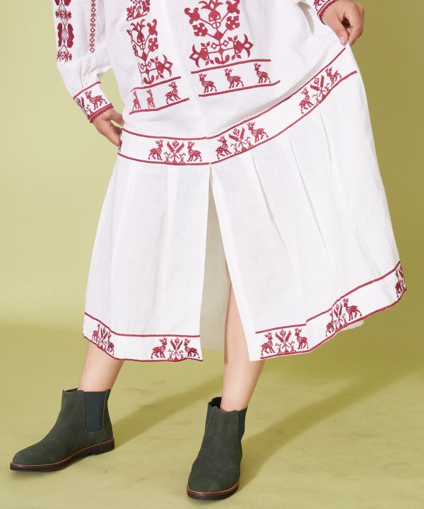 赤と白のコントラストが目を惹くリネン混のワンピース。柄はすべて刺しゅうのインド直輸入の逸品。