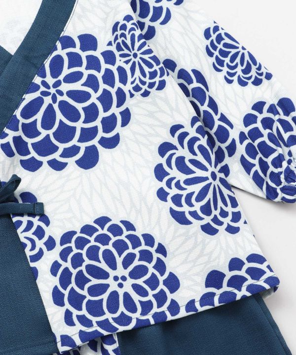 吉祥文様の菊と瑞雲柄の男児用セットアップ。まるで甚平のような衿元や飾り紐で和装の雰囲気を楽しめる。元気いっぱい動き回っても着崩れないのが嬉しいカジュアル和装。100cmサイズ(参考年齢3〜5歳)