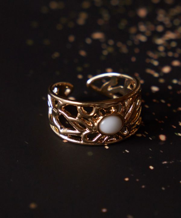 花開く芍薬を透かし絵のように表した華やかなリング。フリーサイズなので、サイズのわからない方にも気兼ねなく贈ることが出来ます。お出かけのお供にぜひ。