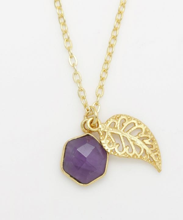 天然石のバースデーネックレス。天然石とリーフのチャームがさりげなく胸元を華やかに演出。