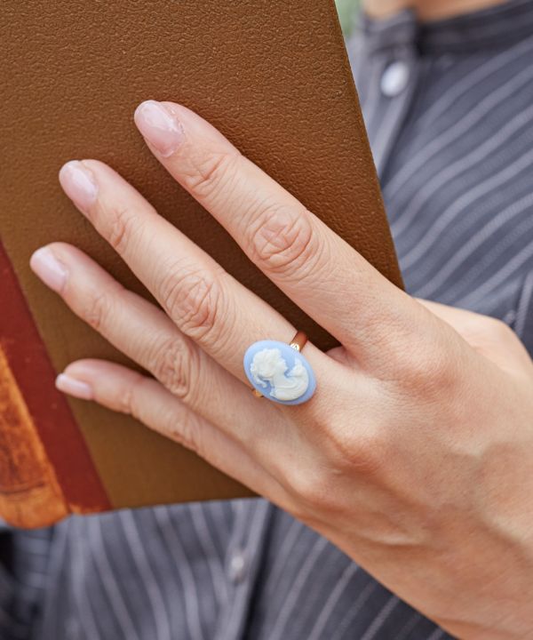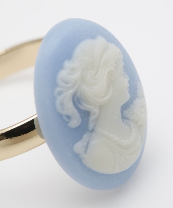 ドイツで作られたカメオガラスのリング。淡くレトロな色合いのガラスに、繊細に施された浮き彫りが上品でステキ。コーディネートのアクセントに。サイズ調節可能。