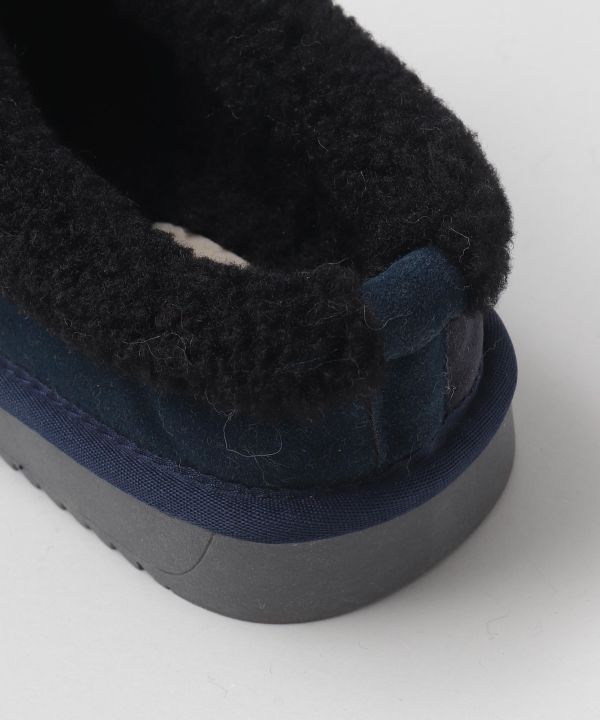 大地を感じさせるバイカラーのサボシューズ。軽くて脱ぎ履きしやすい。内側全体にボア生地がアクセントにもなり、暖かさバツグン。