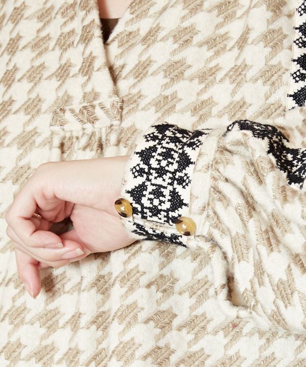 あたたかなウール素材のトップス。千鳥格子刺しゅうが華やかさと上品さを演出。すっきりとしたVネックで首元がシャープな印象に。ゆったりと着られる身幅で、重宝すること間違いなし。