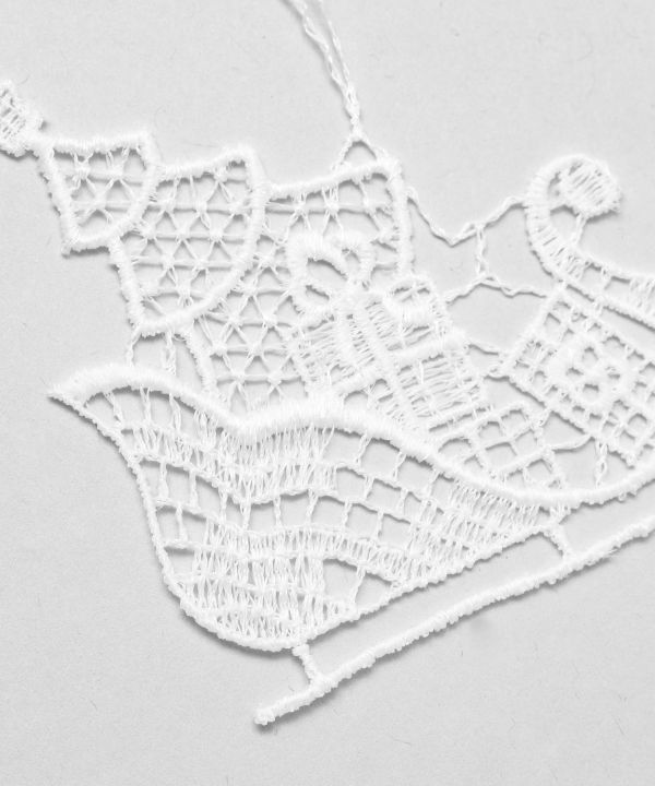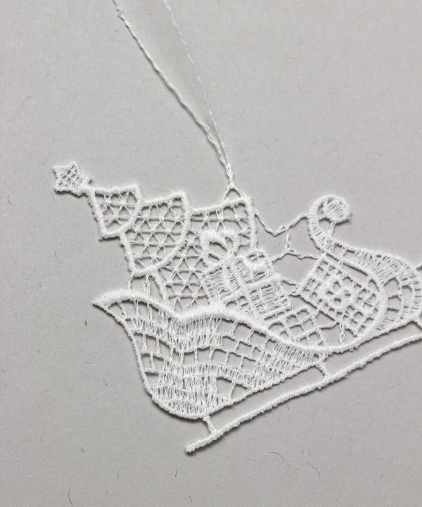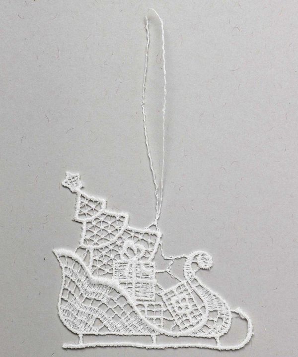 ツリーやプレゼントをたくさん積んだソリをかたどったレースオーナメント。ドイツ・フォクトランドの老舗VOGEL社から仕入れました。職人さんがひとつひとつ手作りした繊細さが魅力。