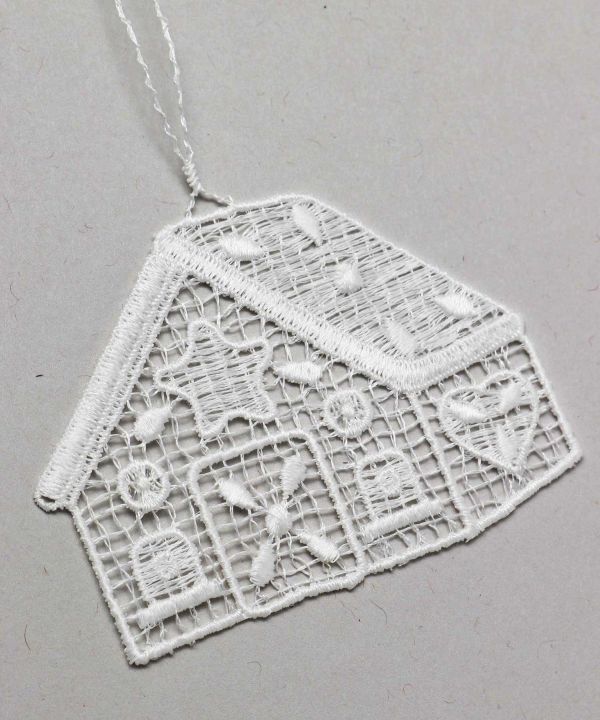 お菓子の家をかたどったレースオーナメント。ドイツ・フォクトランドの老舗VOGEL社から仕入れました。職人さんがひとつひとつ手作りした繊細さが魅力。