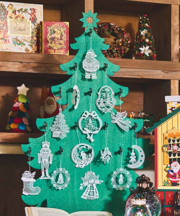 ヒイラギと小鳥をかたどったレースオーナメント。ドイツ・フォクトランドの老舗VOGEL社から仕入れました。職人さんがひとつひとつ手作りした繊細さが魅力。