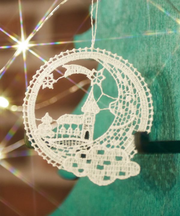 クリスマスの夜の教会が幻想的なレースオーナメントです。ドイツ・フォクトランドの老舗VOGEL社から仕入れました。職人さんがひとつひとつ手作りした繊細さが魅力。