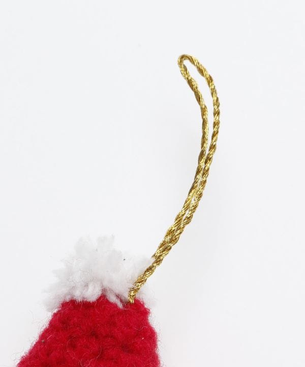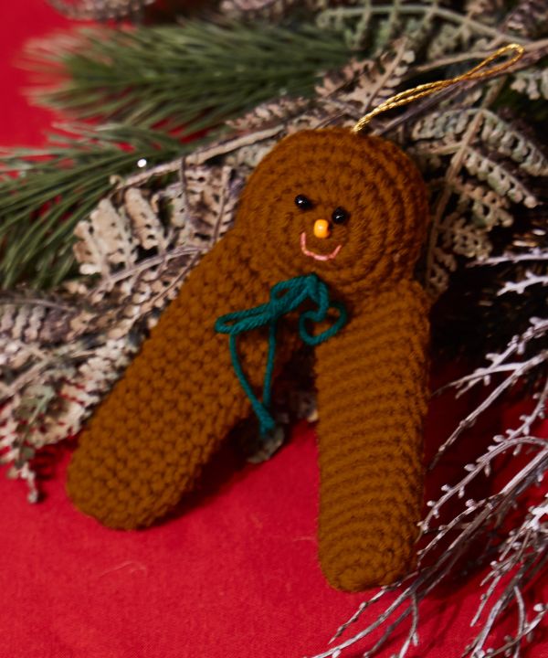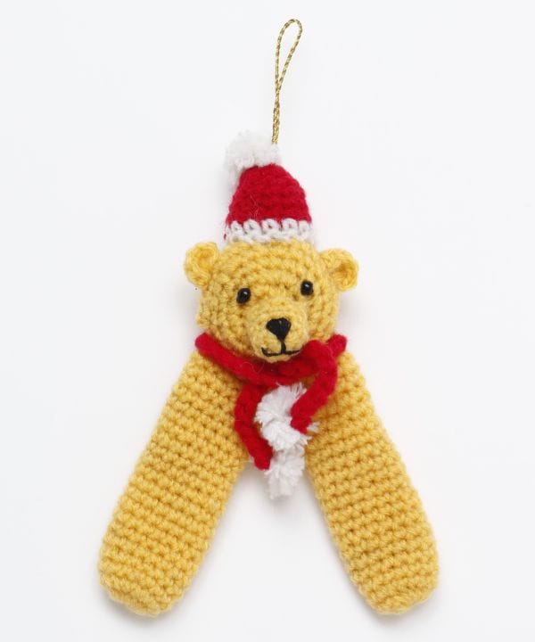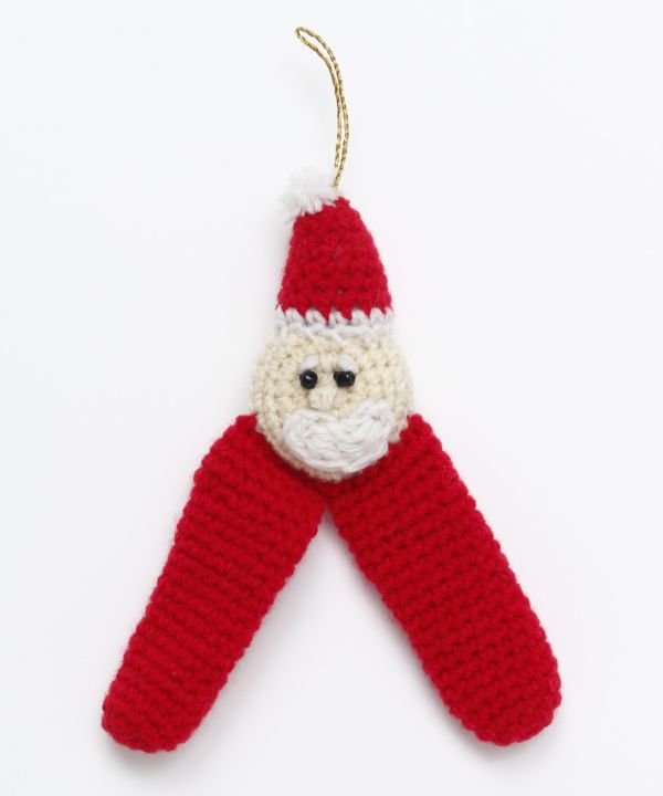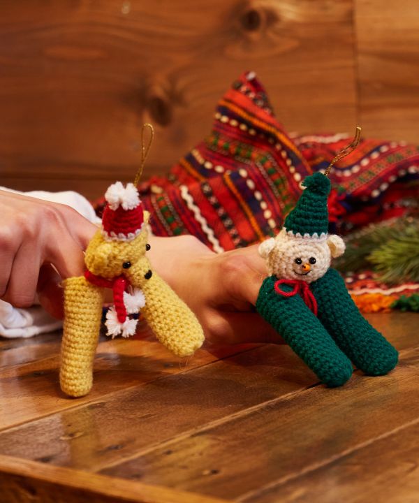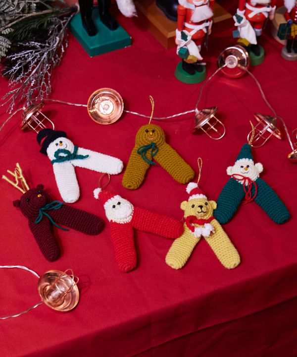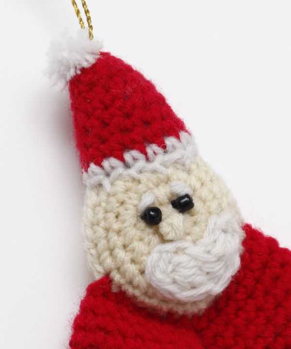 愛らしい表情が魅力の、ニット素材のクリスマスオーナメント。吊るして飾るだけでなく、足の部分に指を入れて遊ぶこともできます。
